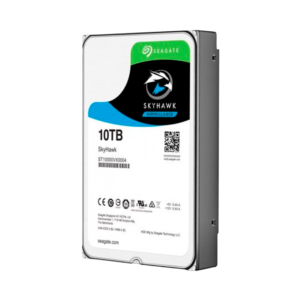 Disco rígido Seagate Skyhawk – Capacidade 10 TB – Intérfase SATA 6 GB/s – Até 32 transmissões de inteligência artificial – Modelo ST10000VE0008 – Especial para Videogravadores de rede (NVR)