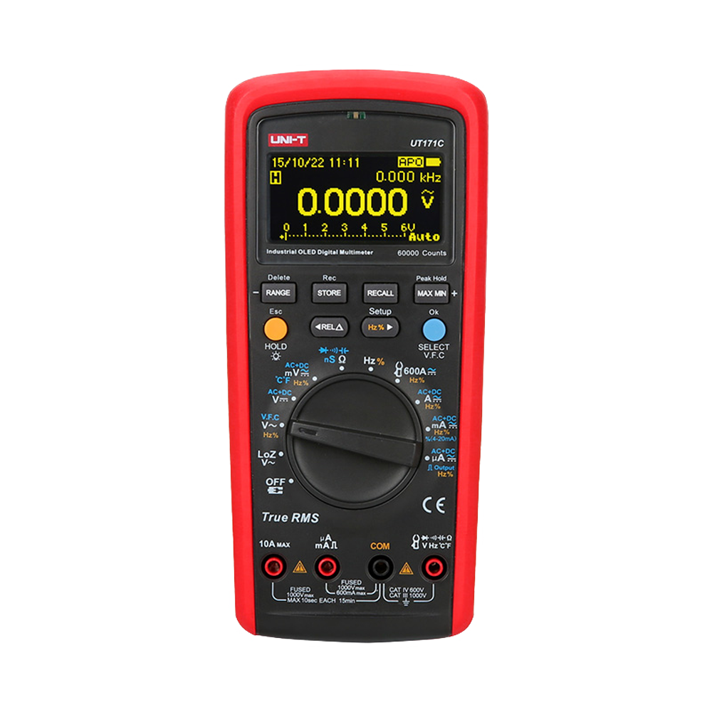 Multímetro digital – Conexión a PC para volcado de datos – Medición AC/DC: hasta 1000V y 10A – Medida de resistencia, capacitancia y frecuencia – Medición de temperatura entre -40°C~1000°C – True RMS | Buzzer continuidad | Test de diodos